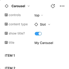 Each content type features its own, unique component properties. Once you’ve selected a content type, its properties can be modified directly in the Design panel. Any edits you make will be applied to your instance of ⬦Carousel