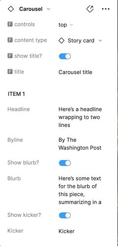 WPDS Carousel takes advantage of component properties, a native feature in Figma. With component properties or ‘props’, we can build components that are flexible enough to configure according to your needs, while preserving reusability. A further benefit of this approach is that we can establish a direct relationship between the design component that lives in Figma and the coded component that lives in the browser, because they share the same properties. (Learn more about “connected components” in our Zeplin resource guide).